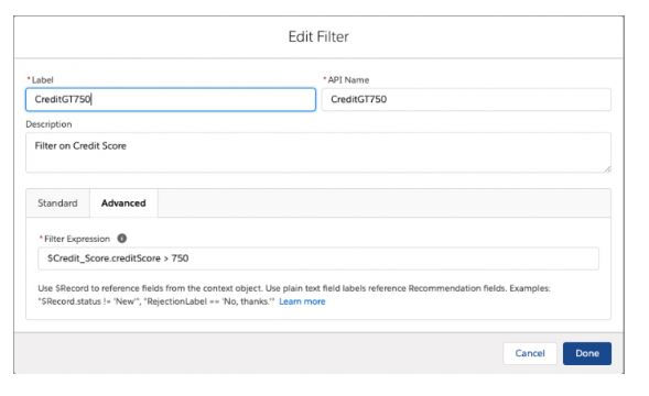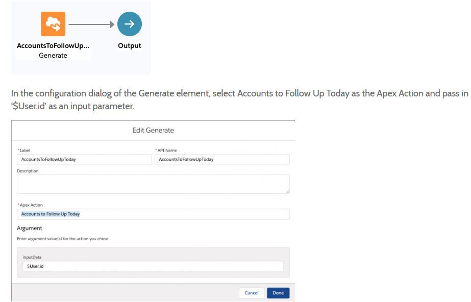 Suppose you want to recommend the top accounts your salespeople should meet with today because the last interaction was more than 90 days ago. With the Generate element, you can call an Apex Action which does a SOQL query for Accounts where the Owner is the logged in user (the salesperson) and identify those accounts where the last contact date was more than 90 days ago. The relevant accounts can be returned in the form of recommendations.